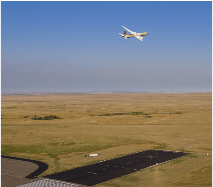 A 787-10 Dreamliner on loan from Etihad Airways for Boeing’s 2020 ecoDemonstrator program makes a low pass over a collection of microphones just past the end of the runway at a research facility near Glasgow, Montana. The maneuver was repeated dozens of times during late August and early September as part of a NASA study to hear how total aircraft noise is affected by the placement and interaction of the jet engines with the airframe. Research results could help inform noise reduction approaches for today’s aircraft, as well as future commercial airliners that may feature designs in which the engines are placed where the wings and aircraft body might help shield the noise – making the airplane sound quieter on the ground.
